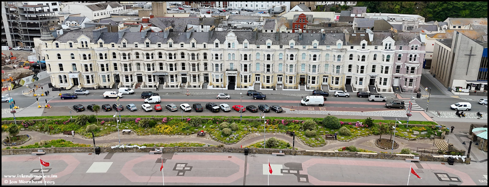 An oblique view of a section of the Sunken Gardens on the promenade.