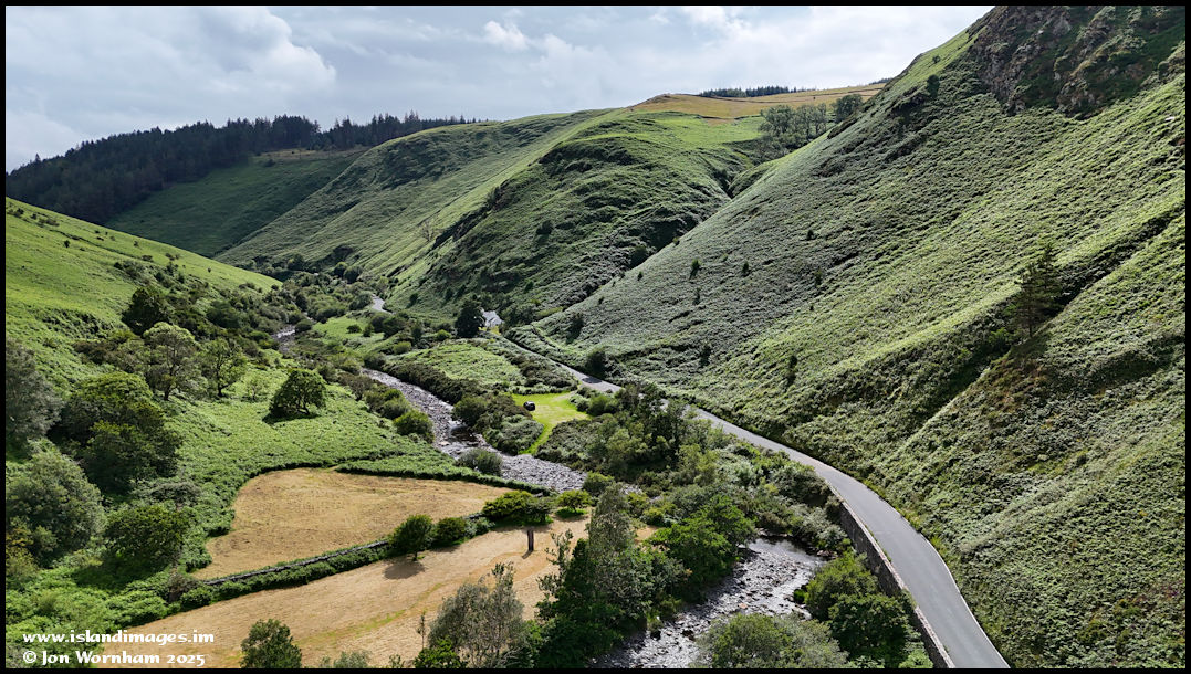 Looking back up the glen past two fields that look as if they've been mown for hay. You can just see the steep zig-zag path from the cottage, up the hill to Killabrega Tholtan, nearly 500 ft above the valley floor here.