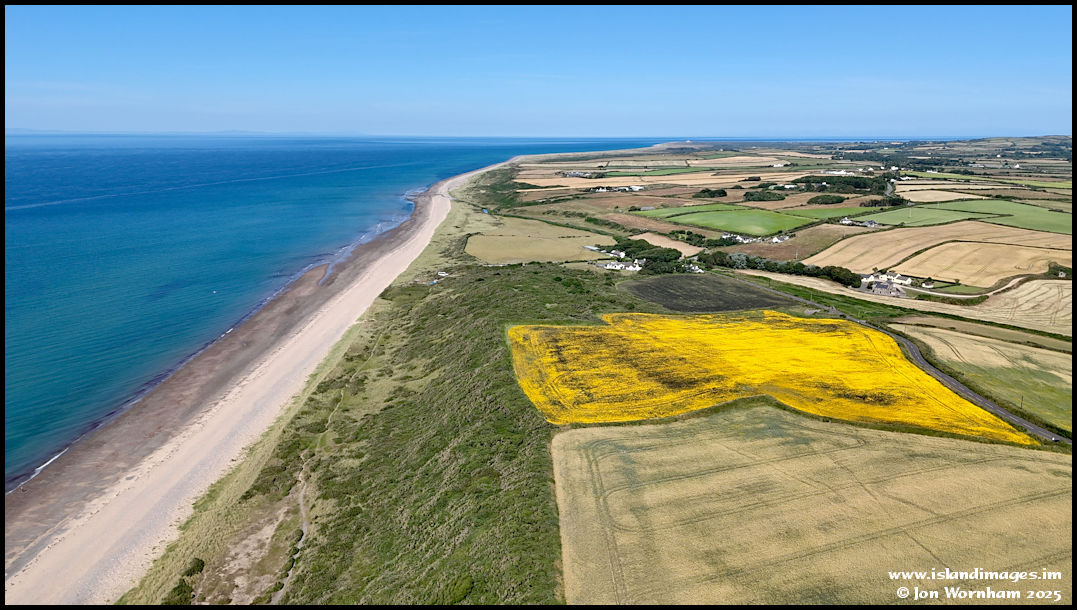Flying out over the low cliffs and looking north along the coastline. The field of Corn Marigolds can be seen to be far from level!