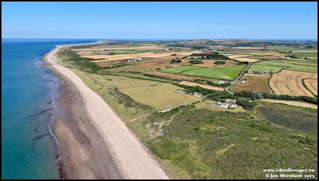Flying out over the beach to look down to the Cronk y Bing Nature reserve, the strip of land just past the car park and stretching up to where the Lhen River crosses the beach.