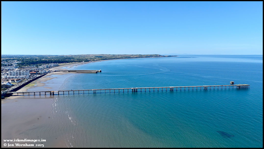 Looking north past the pier and harbour breakwaters, with Bride Cliffs and the Point of Ayre in the distance. The southern Scottish mountains can just be seen on the horizon.
