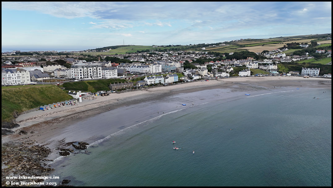 Looking along the wide sandy beach at mid-tide, with some paddle boarders now on the water.