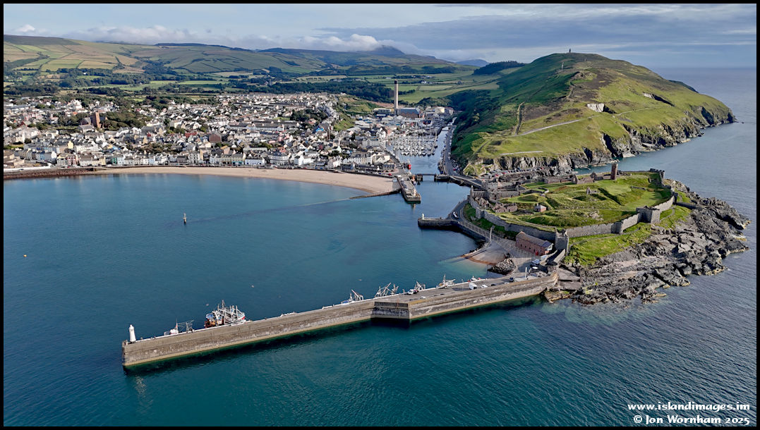 Moving the angle around to include more of the town. Although it's sunny at Peel, there is low cloud sitting on the hills in the distance.