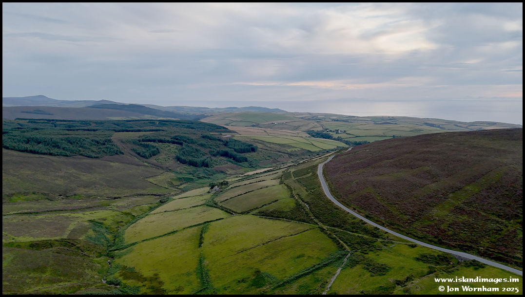 Looking down along the upper Rhenass Valley with the Brandywell to Barregarrow road curving around the slopes of Sartfell. The tholtan of Cronkdhoo is further down in the valley and you can see the course of the loop road that served it.