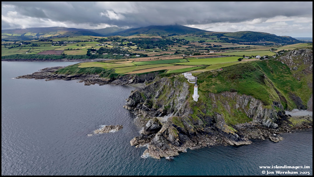 Maughold Head lighthouse, perched part way down the steep cliffs. Cloud is covering North Barrule in the distance.