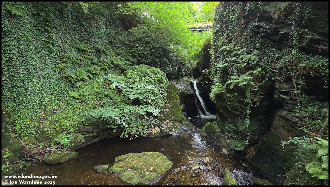 This is the view looking back up from the lower bridge. Not much water coming down the waterfall at preent, after some dry weather.