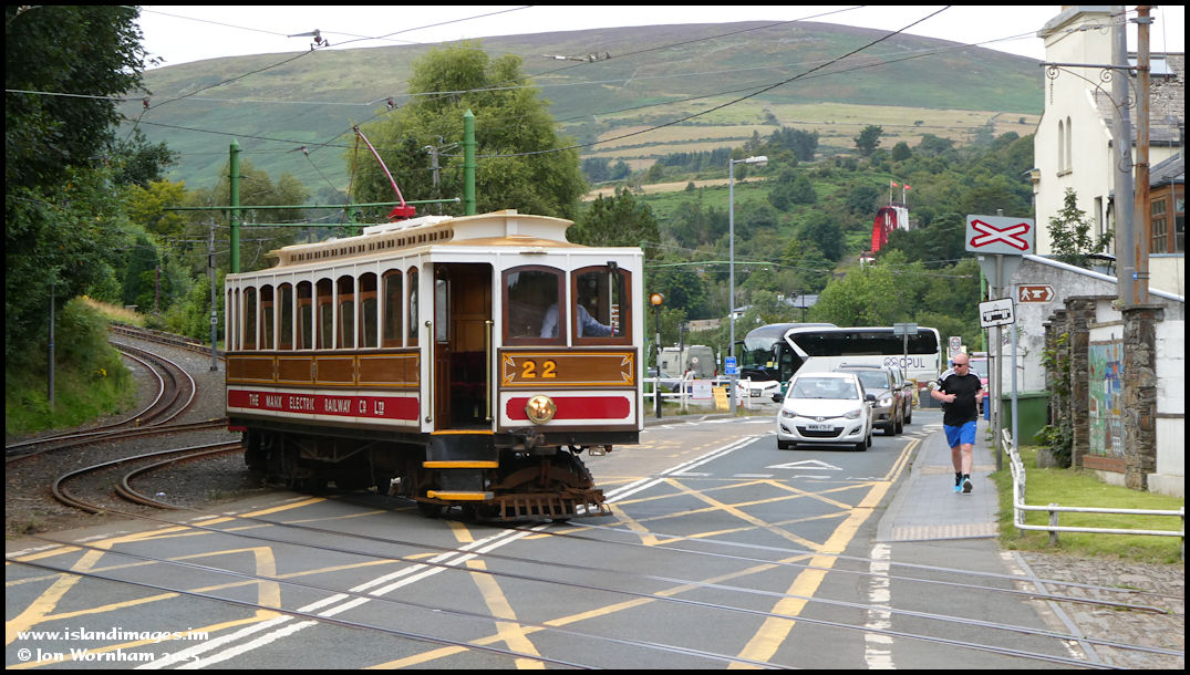 With the shunting maneuvre completed, No 22 crosses the main road again before re-entering the station. The walker/runner on the right looks like he's wondering if he can beat the tram!