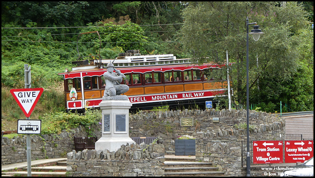 Snaefell Car No 4 passes behind the memorial commenorating the Laxey Miners, on it's way back down from the summit.