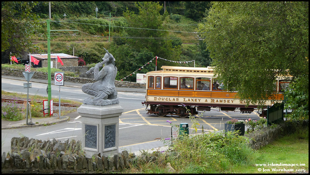 'Douglas, Laxey & Ramsey Electric Railway' liveried Car No 19 crosses over 'Ham and Egg Terrace' on it's way north to Ramsey.