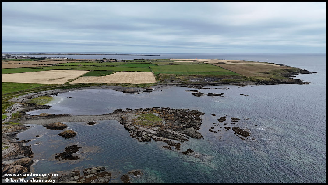 Looking to the east, where this island forms at high tide, connected by a narrow spit of shingle. Beyond is the Pooilvaaish 'black marble' quarry on Scarlett with Langness in the distance.