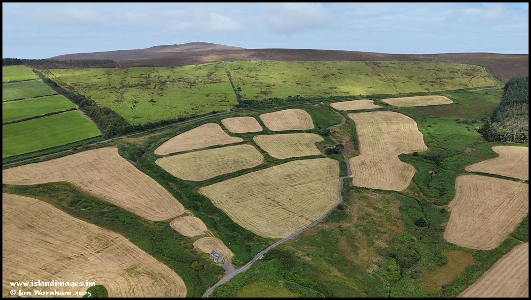 Turning the camera back to look across the round edged fields, with the moorland of Slieau Earystane rising behind. The hilltop in the distance is Cronk ny Arrey Laa.
