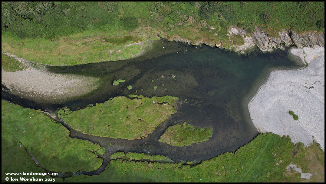 Looking vertically down on the lagoon. At this tide state there would normally be far less water in it, but with no exit channel the beach is retaining the water.