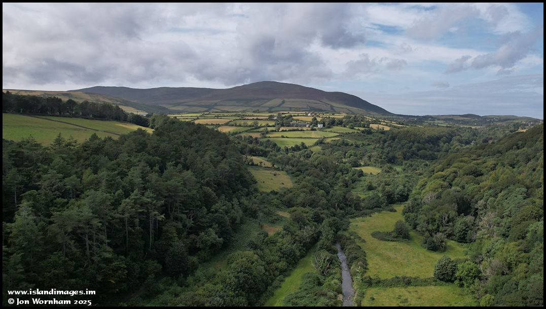 I've flown inland over the lagoon for this shot, looking along the river valley towards North Barrule. Ballaglass Glen is in the middle distance to the right and there's a lovely footpath through the woods to there starting behind the lagoon.