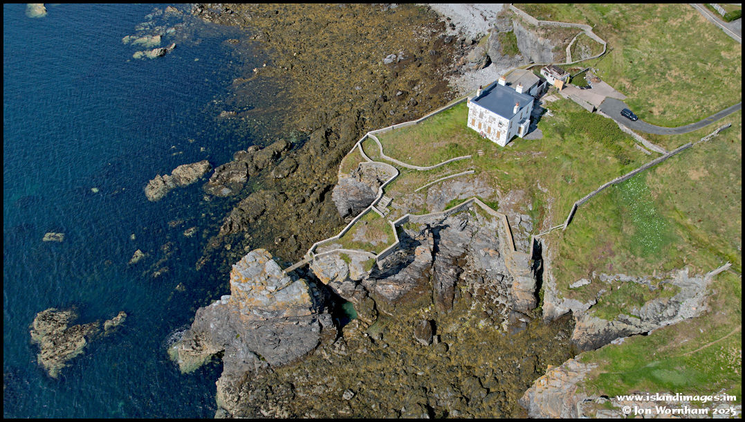 A near vertical view of Strathallan Castle, once the Clifton Hotel. Derelict for many years it is now being renovated and seems to have a shiny new roof. Note the little bridge across to the islet.