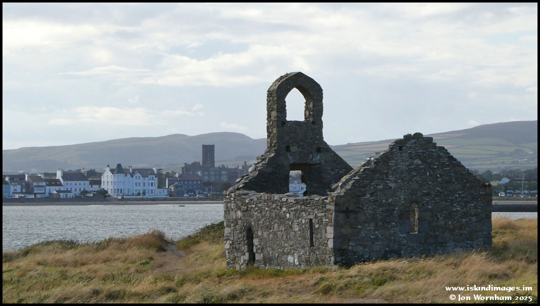 Looking past the ancient chapel and acros the bay to the hamlet of Derbyhaven.
