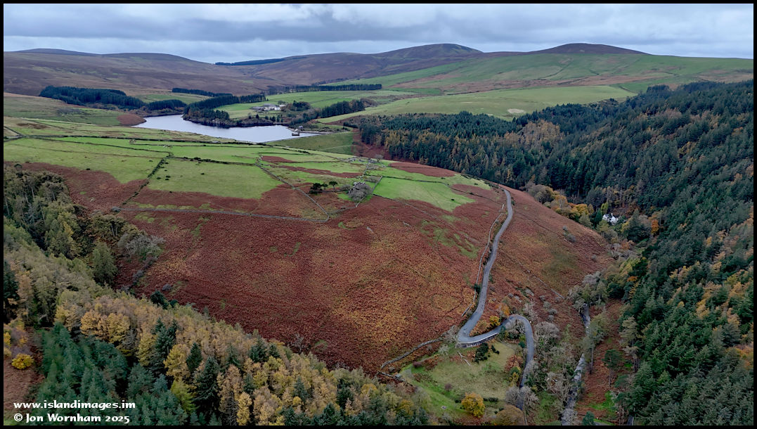 Looking to the south as the road drops down to Tholt-y-Will from Sulby Reservoir.