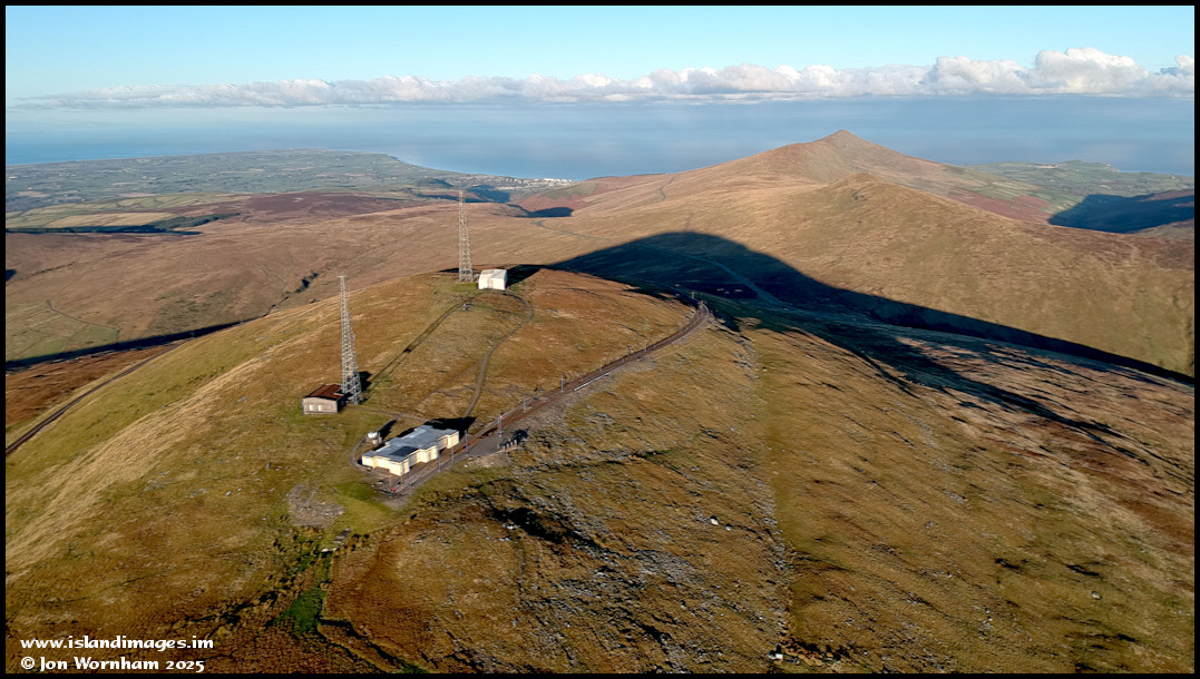 Flying above the summit of Snaefell on the 8th of November 2019, looking towards North Barrule with Ramsey and the northern plaine in the distance.