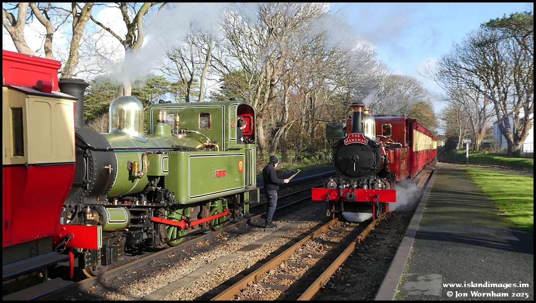 Ready to exchange the single line tokens. 'Loch' is carrying 'The Manxman' headboard.