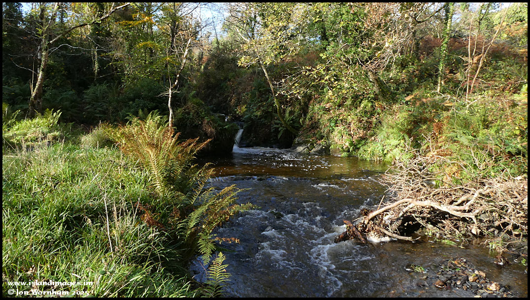 I've moved a little further downstream and the waterfall is just within sight, but the river is still too deep to wade into, but I have a Plan B! I think that there should be enough space between the trees to fly a drone.