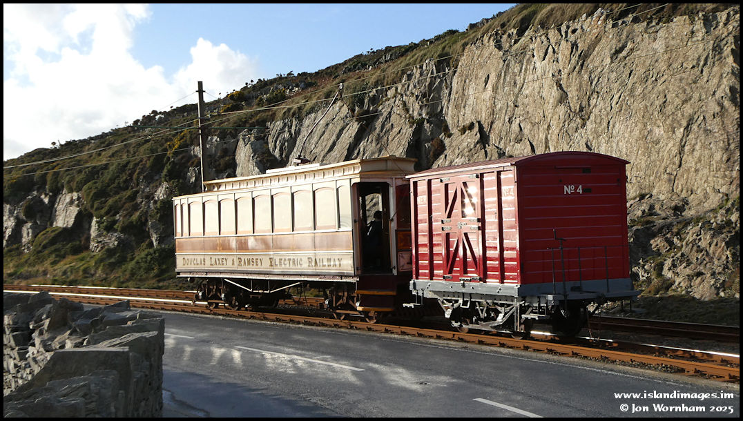 A low sun glints off the windows of Car 19 and highlights the excellent condtion of van No 4 as they start the long descent through Onchan and to Derby Castle.