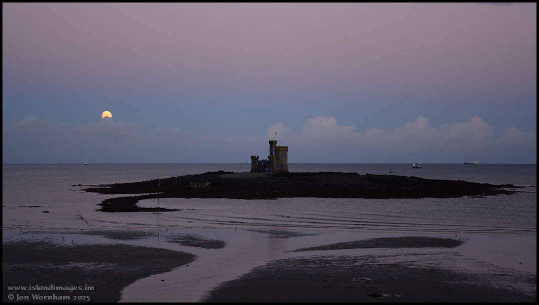 A full moon emerges from the clouds behind the Tower of Refuge on the 5th of December 2014, with several fishing boats and what looks like a tanker, on a calm Irish Sea.