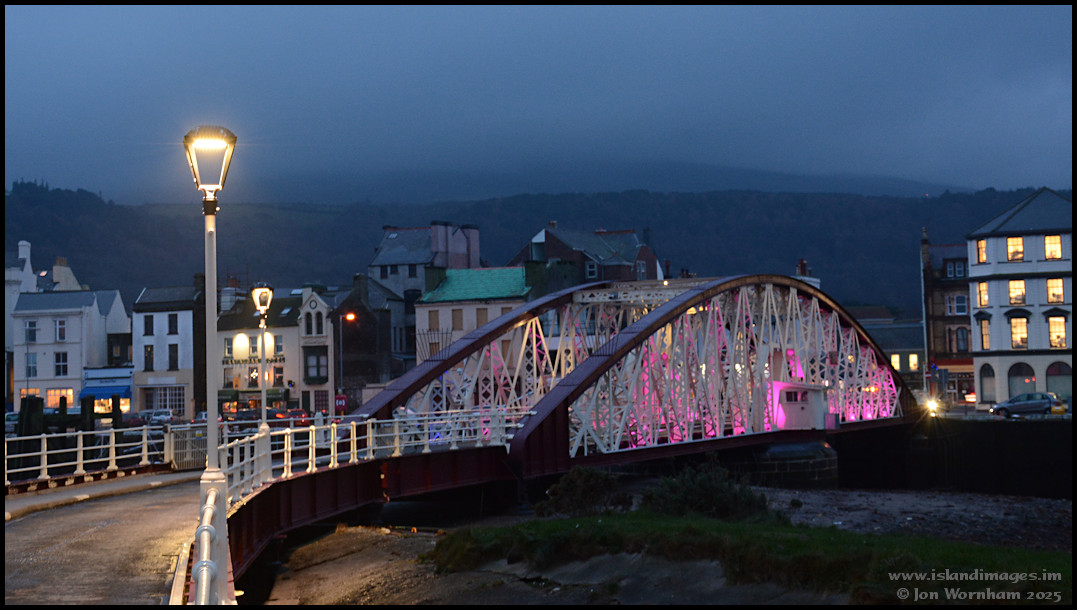 Ramsey swing bridge nicely illuminated at dusk on the 15th of December 2016, with North Barrule hidden in clouds behind.
