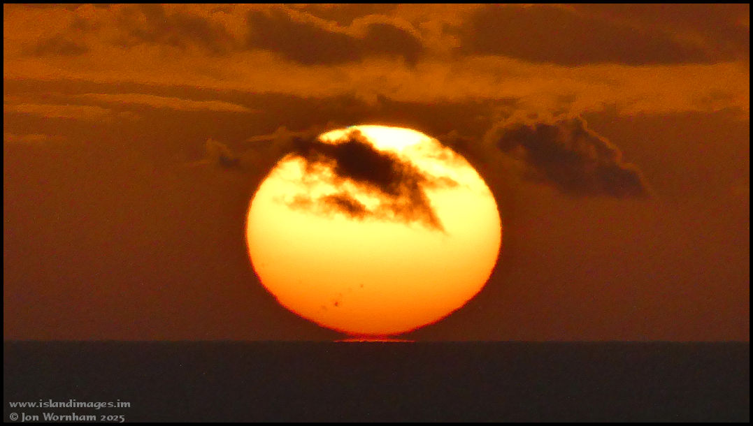 Just two minutes after the first picture and the sun's disk is completely above the horizon. with just a bit of refraction on the sea. The sunspots are now clearly visible.