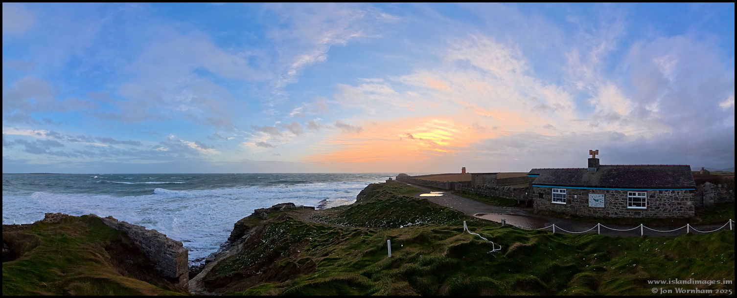 Just a small slice from a 360 degree panorama, looking into the sunset past the visitor centre, now all closed up for the winter.