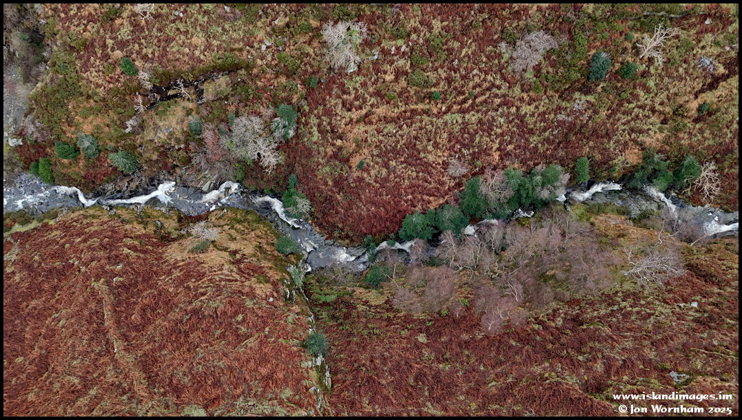 Looking vertically down on the Block Eary river as it twists and turns down the narrow valley.