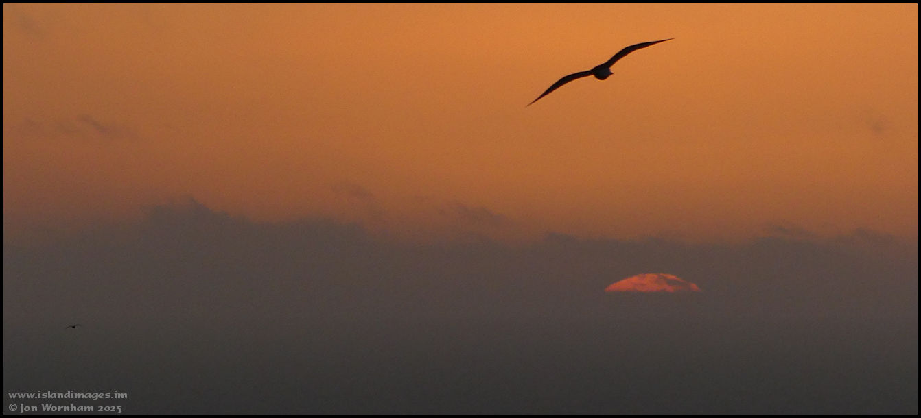 The sun starts to rise from the sea as Herring Gulls swoop around.