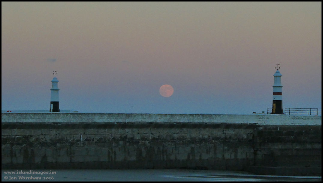 Walking back towards the harbour to frame the moon between the breakwater lighthouses.
