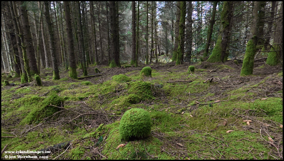 Down at ground level and moss covered stumps in an area where trees were felled selectively,