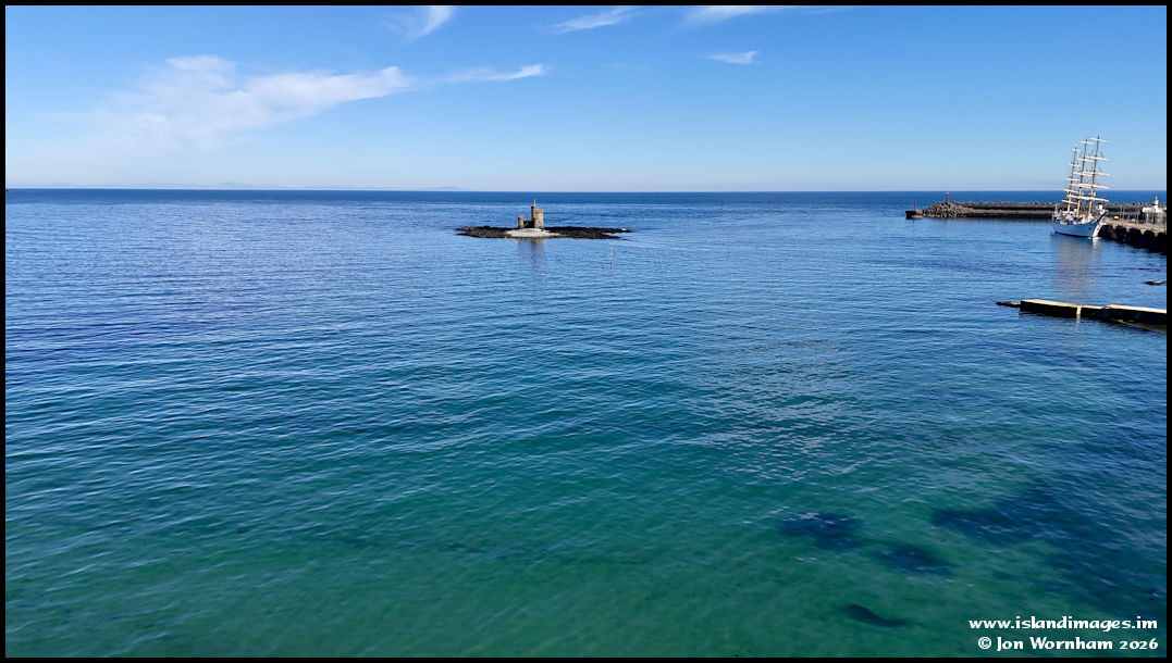 A final view of the Conister Rock and Tower of Refuge, looking out to sea from close to the Promenade, with the tall ship over on the right.