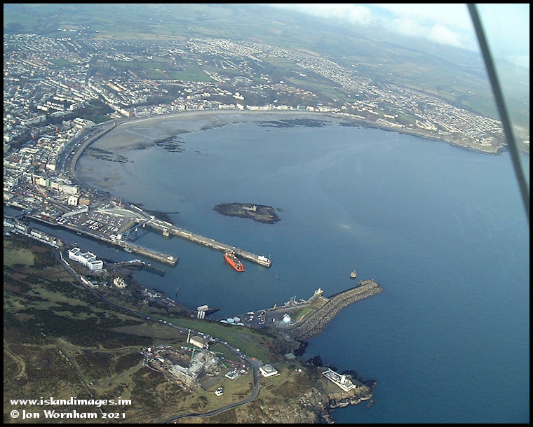 Having departed from Ronaldsway and established the aircraft in level flight, we're passing Douglas, where the Douglas Head Apartments are under construction.