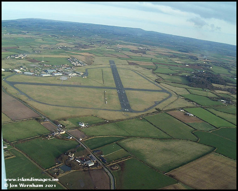 Looking along runway 08 at Jurby. The runway was extended at the far end across the Sandygate road in the 1960s to allow Vickers Viscount turboprop airliners to land here as a diversion from Ronaldsway.