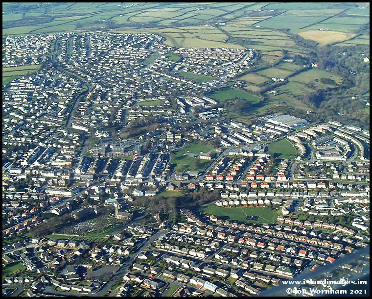 Onchan. St Peter's Church on old Onchan stands out well towards the bottom left, then the village spreads upwards to Birch Hill at the top.