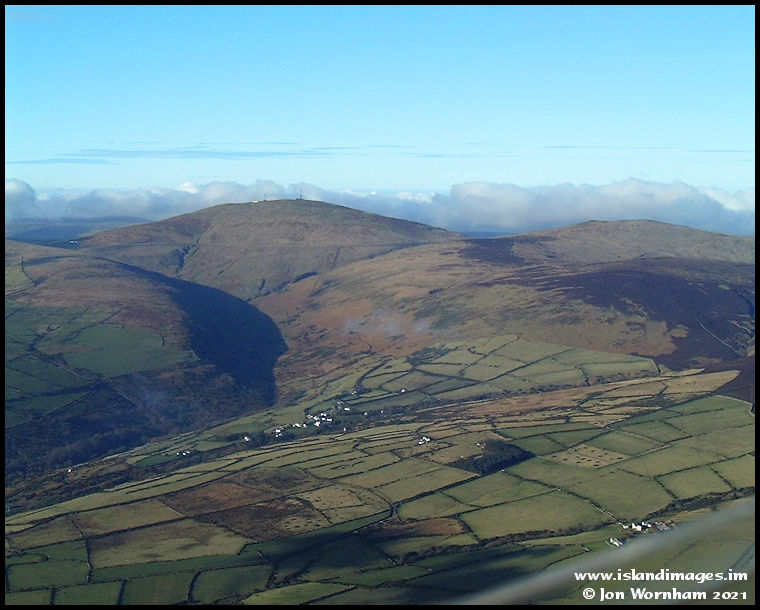 Looking across Agneash and along Laxey Glen to Snaefell. Although the time is around 1 o'clock PM, the low sun is casting a big shadow into the glen.