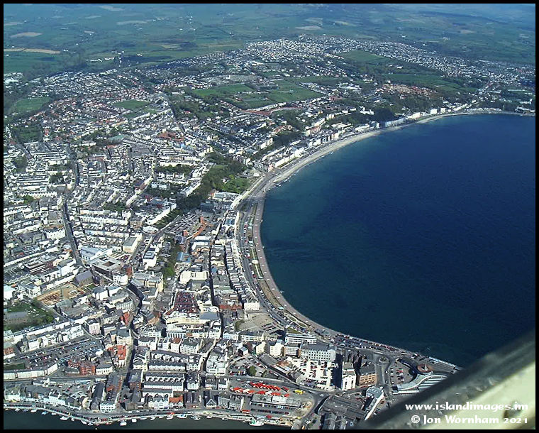 Looking along the promenade and towards Noble's Park and Onchan. We still had a central bus station with waiting room and cafe in those days, you can see all the red buses near the bottom of the picture.