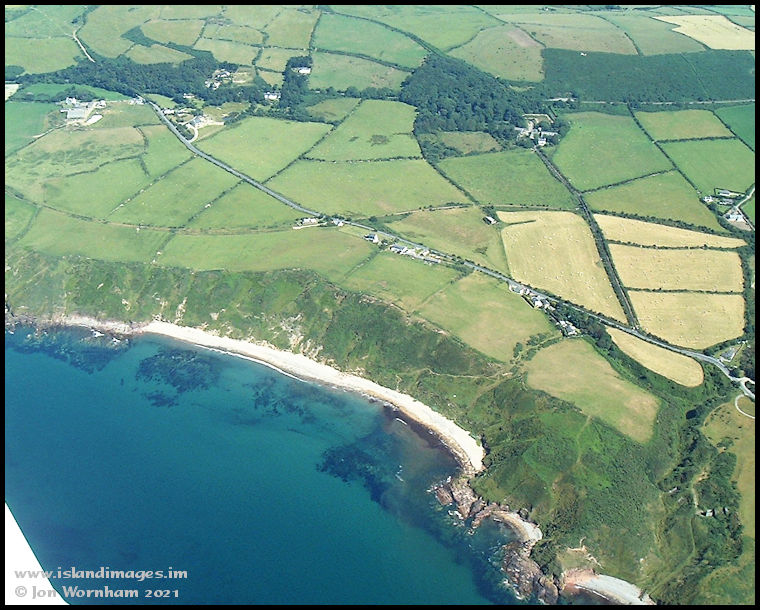 Nice clear seas at White Strand beach, north of Peel. The line of the Manx Northern Railway can be seen curving through the field, with the former St German's Station where it crosses the road.