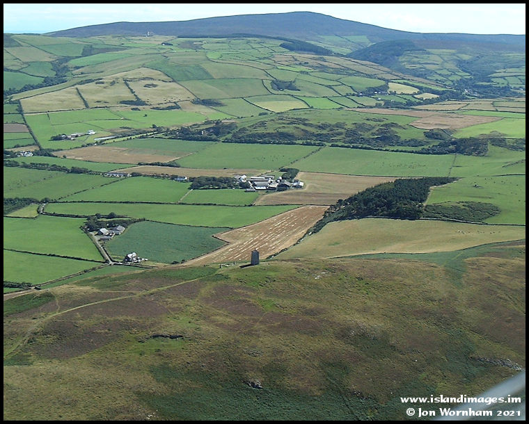 Looking across Peel Hill and Corrin's Tower, with Knockaloe Farm in the valley below.