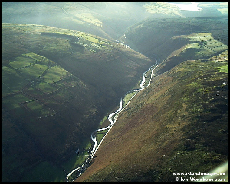 Sulby Glen. Although it's almost mid-day,the low angle of the mid-winter sun is glinting off the Sulby River and the wet road surface of the Tholt-y-Will road.