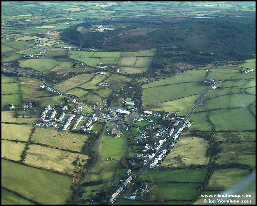 Orbiting around the main Foxdale village, with Stoney Mountain Plantation behind.
