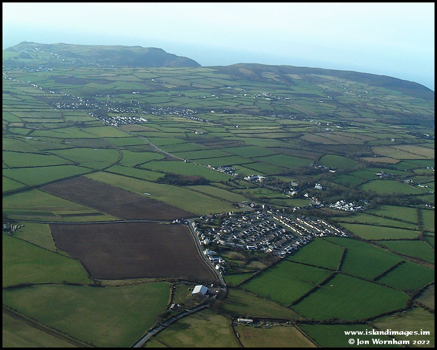 Climbing away from Roanaldsway to the north, the village of Ballabeg in the foreground with Colby towards the top left and Bradda in the distance.