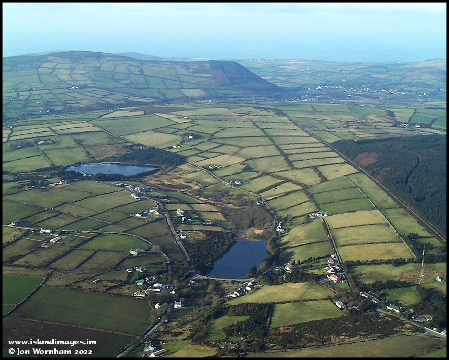 The Eary and Kionslieau Reservoirs near Foxdale. Some unusually regular shaped fields (for the IOM) along the Ballavar Road by Archallagan Plantation.