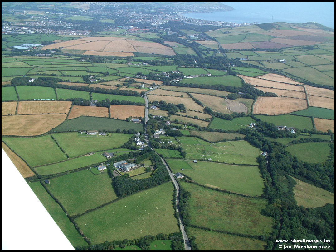 This is the Old Castletown Road as it heads towards Douglas in the Quine's Hill area. Port Soderick railway station can just be seen in the trees towards the right hand side.