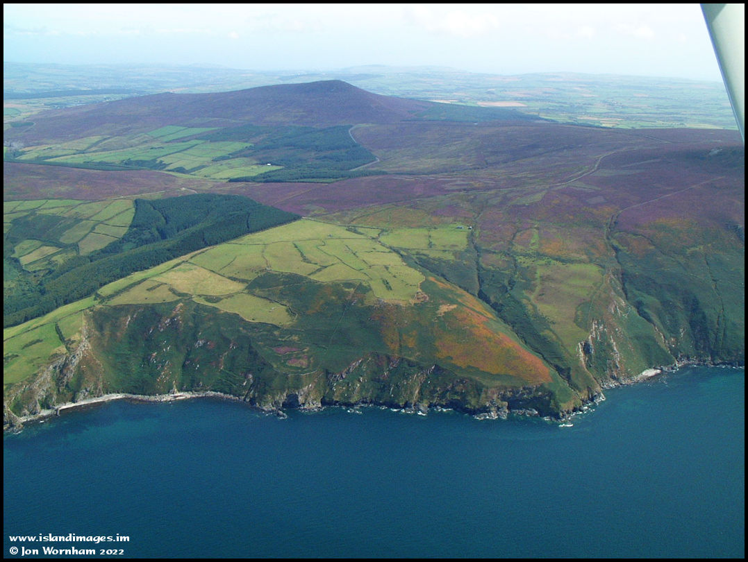 Gob-ny-Ushtey and the isolated farmstead of Eary Cushlin. The hilltops are covered with purple from the flowering heathers.