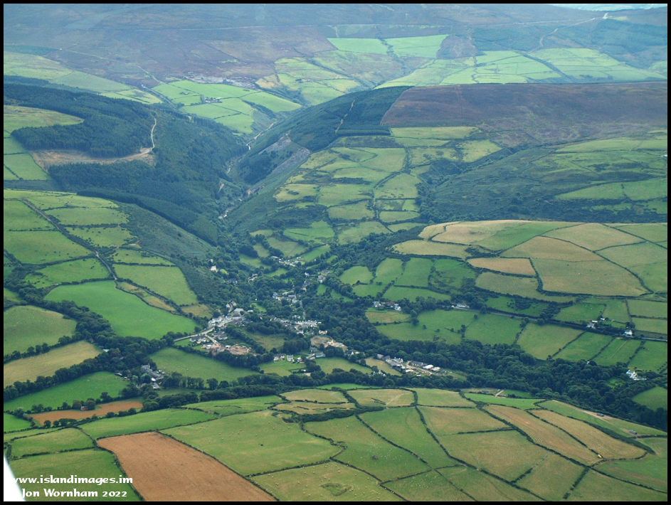 Glen Maye village, with the Glen Mooar valley heading away between the trees before turning to the right and becoming Glen Rushen. Beckwith's Mine can be seen towards the top left.
