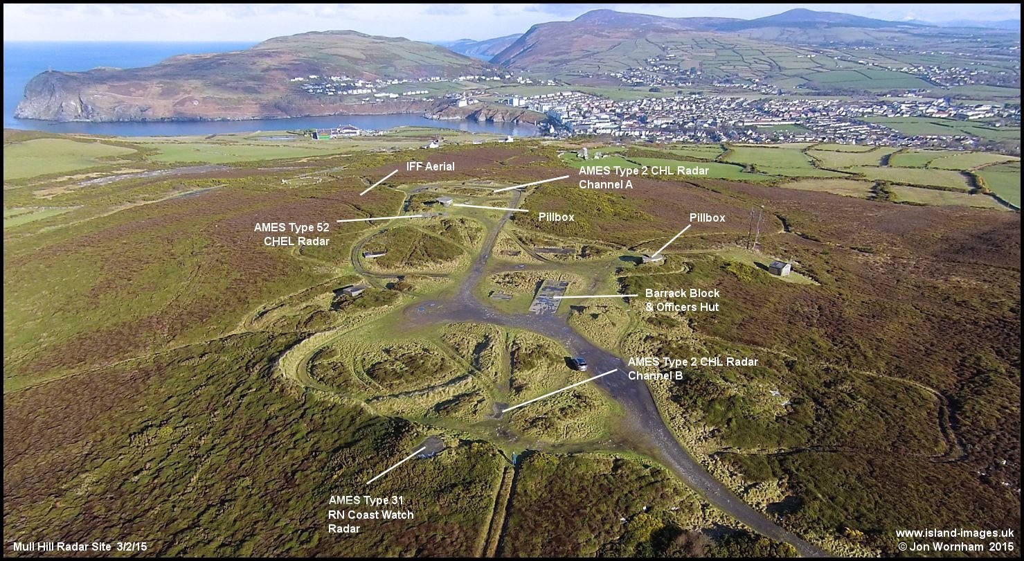 An aerial view of the Cregneash radar site on Mull Hill with locations of the main components indicated.