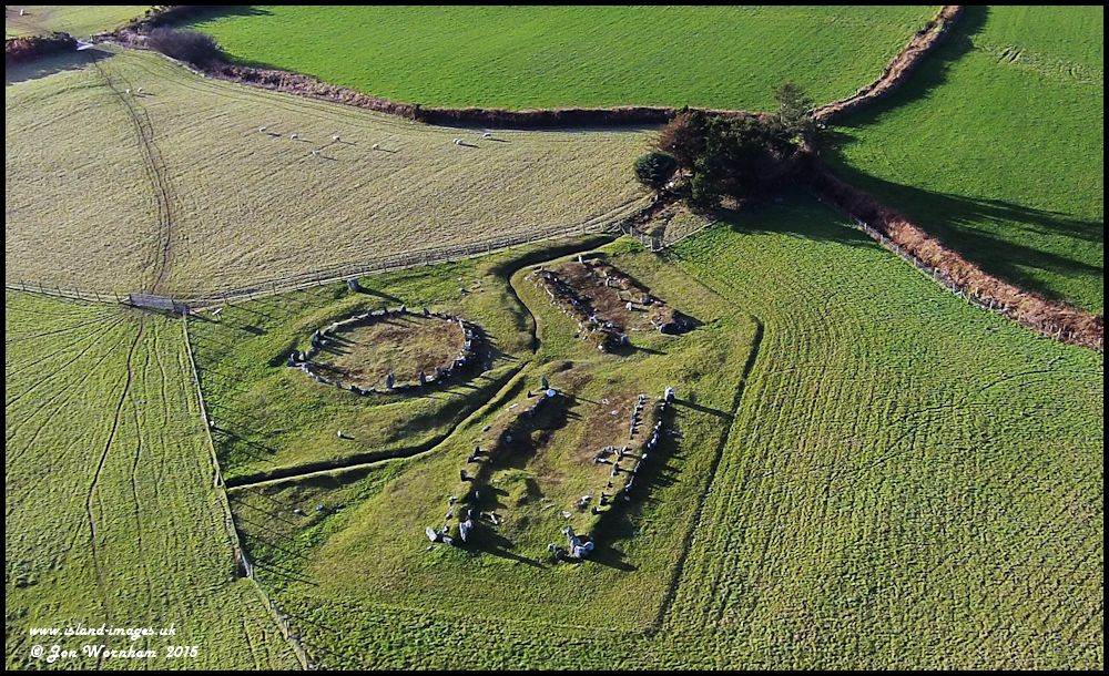 Almost vertical view showing the roundhouse and two longhouses, notice the thickness of the walls on the longhouses