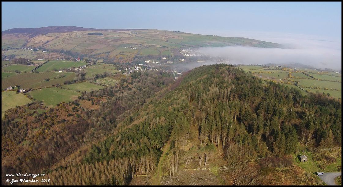 Axnfell plantation with sea fog creeping in over Laxey and the Laxey Wheel just visible